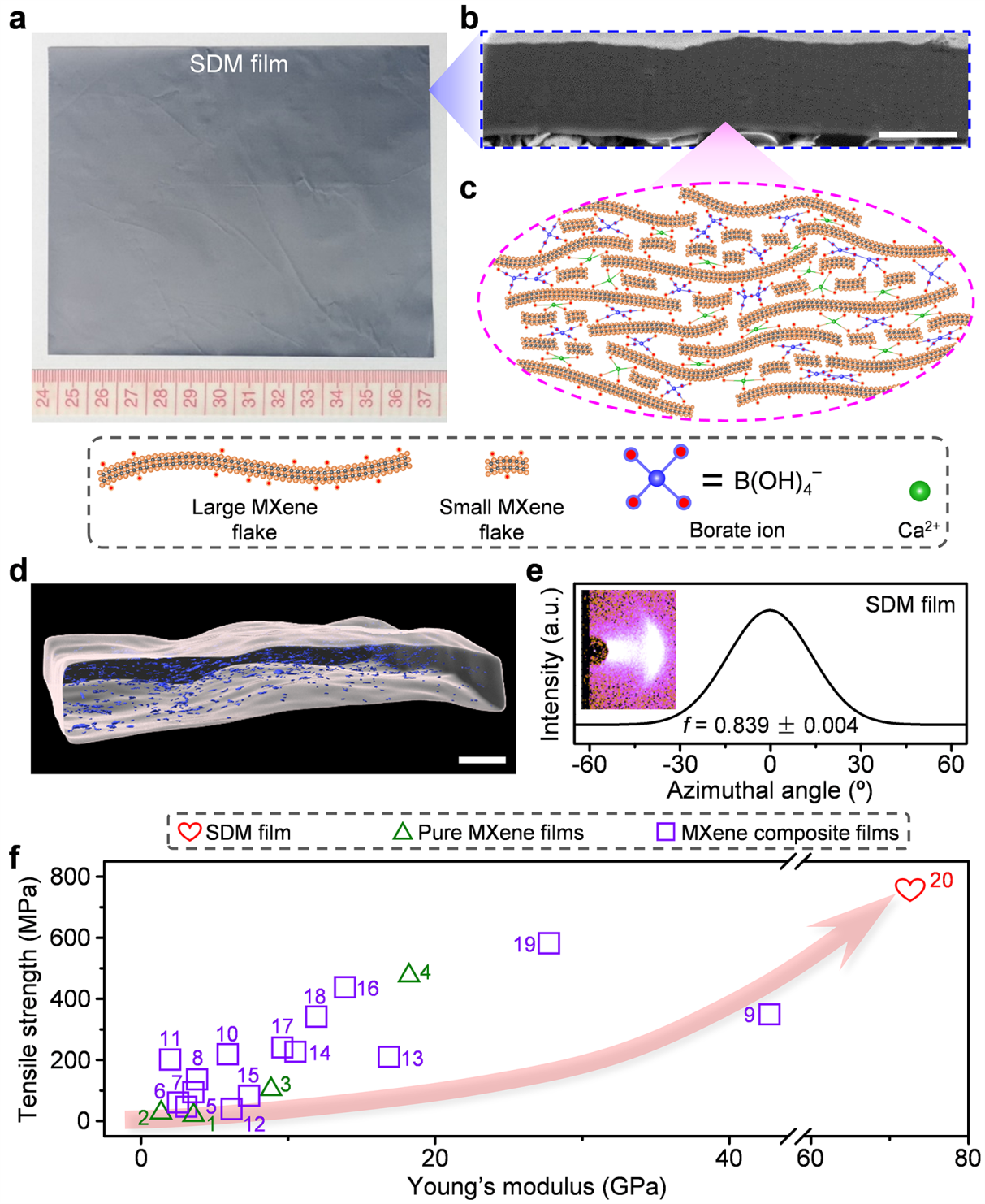 鉴于此,程群峰教授团队通过在大尺寸碳化钛纳米片(大片)层间有序引入小尺寸碳化钛纳米片(小片)和钙离子、硼酸根离子交联,制备了超强有序致密化碳化钛薄膜(SDM,图1)。小片可以填充多层大片之间的孔隙,但增大了单层碳化钛纳米片间距、降低了碳化钛纳米片取向度;进一步通过钙离子和硼酸根离子交联,可以减小单层碳化钛纳米片间距、并提升碳化钛纳米片取向度,因此这种有序致密化策略充分利用了小片填充和界面交联的优势,不仅增强了界面作用,同时保持高取向片结构,实现了协同消除大片层间的孔隙。所制备SDM薄膜不仅具有超高的拉伸强度、杨氏模量、韧性、电导率和电磁屏蔽性能,还具有优异的抗氧化性能和红外热伪装性能。本工作为将来高性能组装其他二维纳米材料提供了新的研究思路,同时,这种SDM薄膜可规模化制备,在柔性可穿戴电子器件、军用红外隐身衣、电磁屏蔽涂层、航空航天等领域具有重要应用前景。