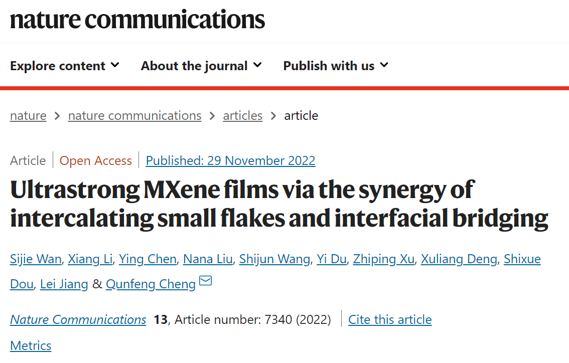 2022年11月29日,《Nature Communications》在线刊登了米兰官网米兰milan官方网站程群峰教授课题组的最新研究成果“小片填充和界面交联协同致密化的超强MXene薄膜”(英译:Ultrastrong MXene films via the synergy of intercalating small flakes and interfacial bridging),米兰官网米兰milan官方网站万思杰副教授、李响、北大口腔医院第一门诊部陈英博士、米兰官网物理学院刘娜娜博士为第一作者,程群峰教授为通讯作者,米兰milan官方网站米兰milan官方网站为第一完成单位。