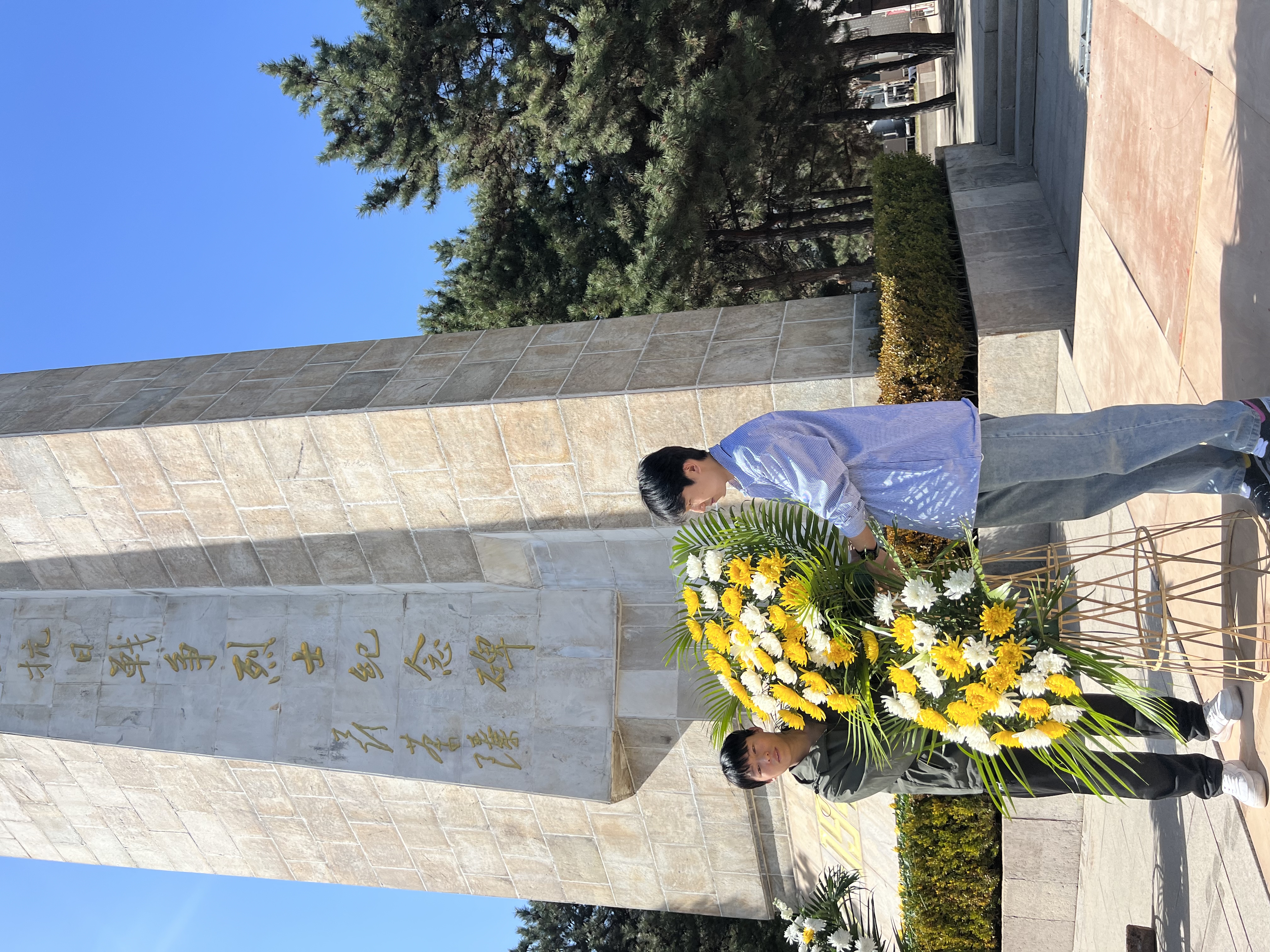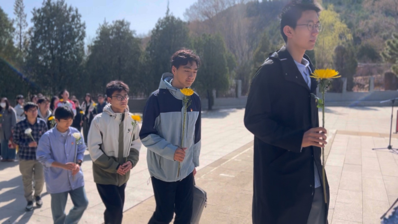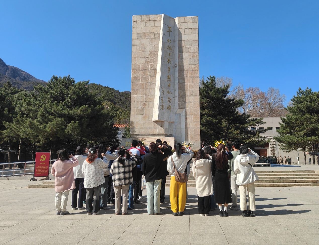 清明寄哀思,传承正当时。平北抗日烈士纪念园静谧安详,庄严肃穆,纪念碑耸立苍松翠柏之中。全体师生怀着崇敬的心情,沿着台阶缓缓拾级而上,向抗战烈士敬献花篮,为在抗日战争中英勇牺牲的烈士集体默哀。师生依次瞻仰纪念碑,深切缅怀抗日英烈的不朽功勋。在纪念碑前,大家齐唱国歌,向为抗战献出生命的先烈致以深切哀思。辅导员代表孙伟伟带领师生重温入党誓词。