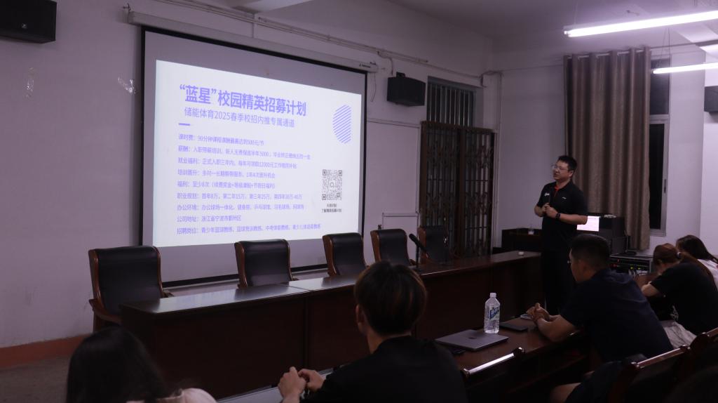 为进一步拓宽学生就业渠道,深化校企合作,助力体育专业人才高质量就业。5月14日晚,永利集团304官网持续开展招聘就业宣讲会暨企业专场校园招聘会,本次宣讲会邀请到浙江省宁波储能体育有限公司。永利集团304官网2025届毕业生以及2022级、2023级学生代表参加宣讲会。