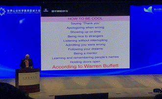 2007年诺贝尔经济学奖获得者Eric Maskin先生以“医学研究成果应该授予专利吗?”为题,向大家展示了科技与生活,科技与社会的重要关系,引发了大家的思考。2016年诺贝尔物理学奖获得者Duncan Haldane先生从自己的求学经历以及与导师相处关系为实例发表了关于科学与教育的讲话。其中教授关于如何与导师积极沟通交流以及中学化学老师重要性的观点很值得我们学习。克隆之父Ian Wilmut,一生都在为科研奋斗,在给嘉宾及学生代表讲述从克隆羊多利到个性化治疗的主题演讲在讲到多利时就像在讨论自己的孩子饱含深情,这一点深深打动了我们。褚君浩院士发表了科技创新开拓智能时代这一有深度的演讲,不仅阐述了当下科研工作的现状还为未来科研的发展指明了方向,并对新一代青年提出了勇于担责不断创新的要求。2014年诺贝尔物理学奖获得者中村修二发表了主题为蓝光LED的发明与未来半导体照明的演讲,不仅全面形象的论述了当下蓝光LED面临的问题以及给人类带来的危机,还给提出了未来半导体照明发展方向。褚君浩院士发表了科学进步与科学共同体的责任的主旨演讲,提出让科学伦理建设与科学创新齐头并进的观点。2016年诺贝尔化学奖获得者James Fraser StoddartJames就创新驱动领先的科学研究的主题进行演讲,强调要鼓励青年人创新,做自己喜欢并享受的事(DONE YOUR OWN THING),让同学们重新审视自己的人生,最后还给同学们一些当代处世的建议。这些都令我们受益良多。参加此次会议不仅能近距离的与诺奖获得者接触还给同学们带来了很多感触,真切的感受到优秀的科学家对待科研真理的严谨的负责的态度以及勇于承担社会责任为科研奉献的精神。2010年诺贝尔物理学奖获得者konstantin关于未来的材料发表了主题演讲,激发了同学们对未来材料的兴趣。