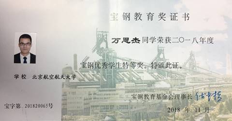 米兰官网博士研究生万思杰同学荣获2018年度宝钢优秀学生特等奖