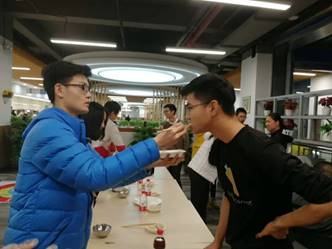 在第一锅饺子出锅后,我们的第一个游戏便开始了。首先我们进行的是抢水瓶游戏,米兰milan官方网站的导员黄澄玉和丁少松同学给大家做了一个示范,主持人说出一个身体的部位,两人分别摸自己的相应部位,在主持人说出“水”这个字的时候,两个人同时去抢桌子上的水瓶,但是黄导更快一步,于是作为输了游戏的人要被黄导喂五个饺子,场景太有爱了。之后同学们也积极加入到这个游戏中来,这也是一个很幸福的游戏了。